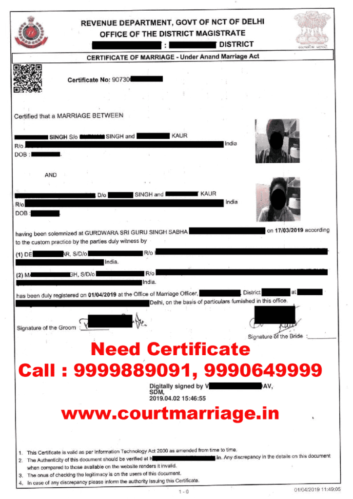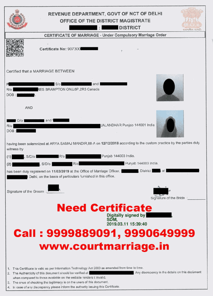 For Marriage Registration under Hindu Act: You can apply at office of the Sub-Divisional Magistrate in whose jurisdiction the marriage was solemnized or the husband or wife resides on any working day. Fill the Application form duly signed by both husband and wife. Verification of all the documents is carried out on the date of application and a day is fixed for the appointment and communicated to the parties for registration. On the said day, both parties, along with two witnesses, need to be present before the ADM. The Certificate is issued on the same day.